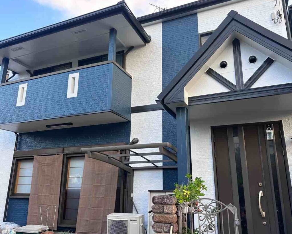 【外壁】株式会社アステックペイント プラチナリファイン2000SiーIR 8108 マウンテンブルー 9006 ペリウィンクルブルー 【屋根】福泉工業株式会社 MFシルキー ブラック |