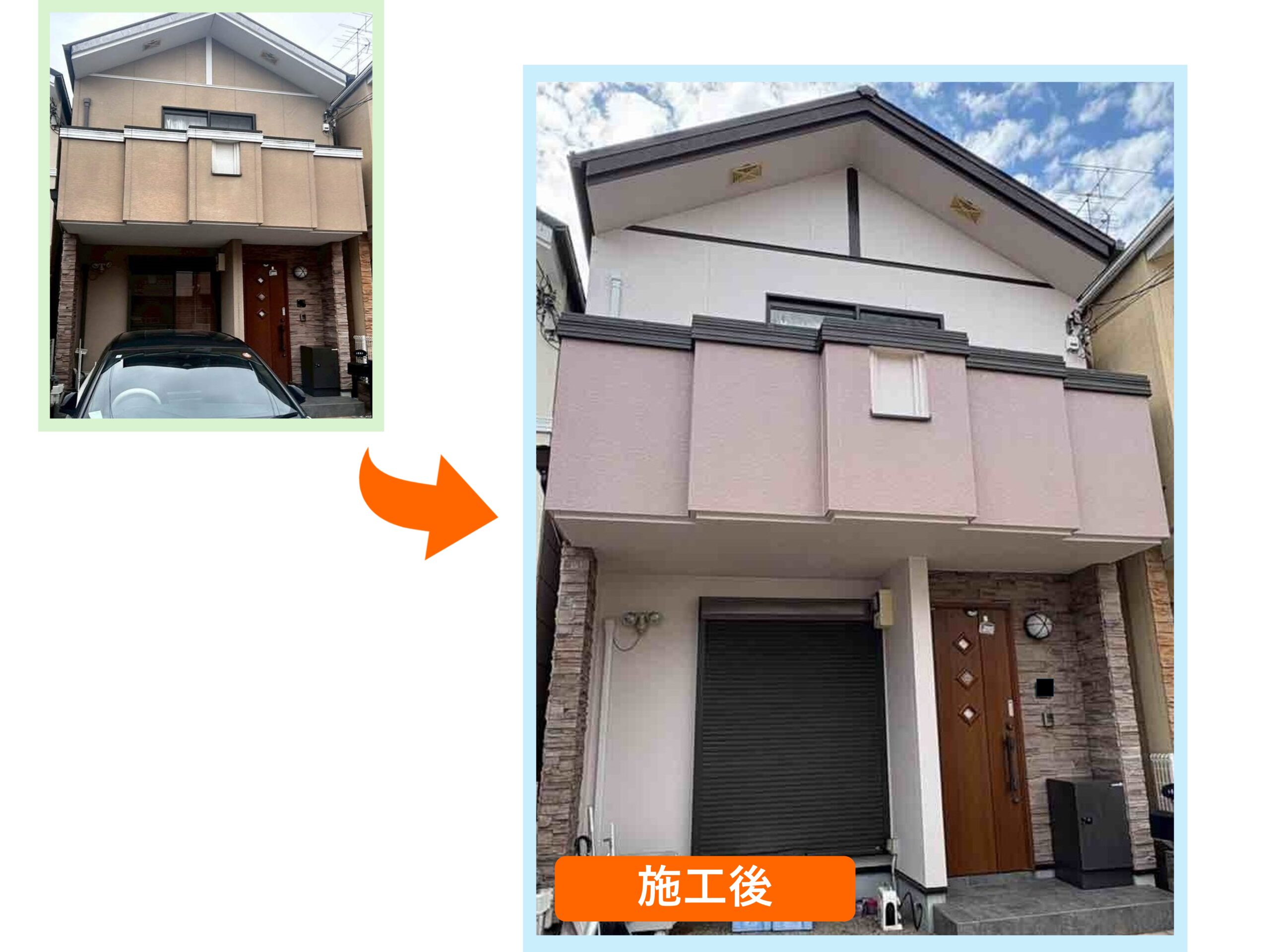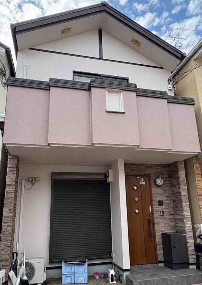外壁塗装につきましては、色選びにもこだわり、ピンクとブラウンを基調とした配色でまとめさせていただきました。