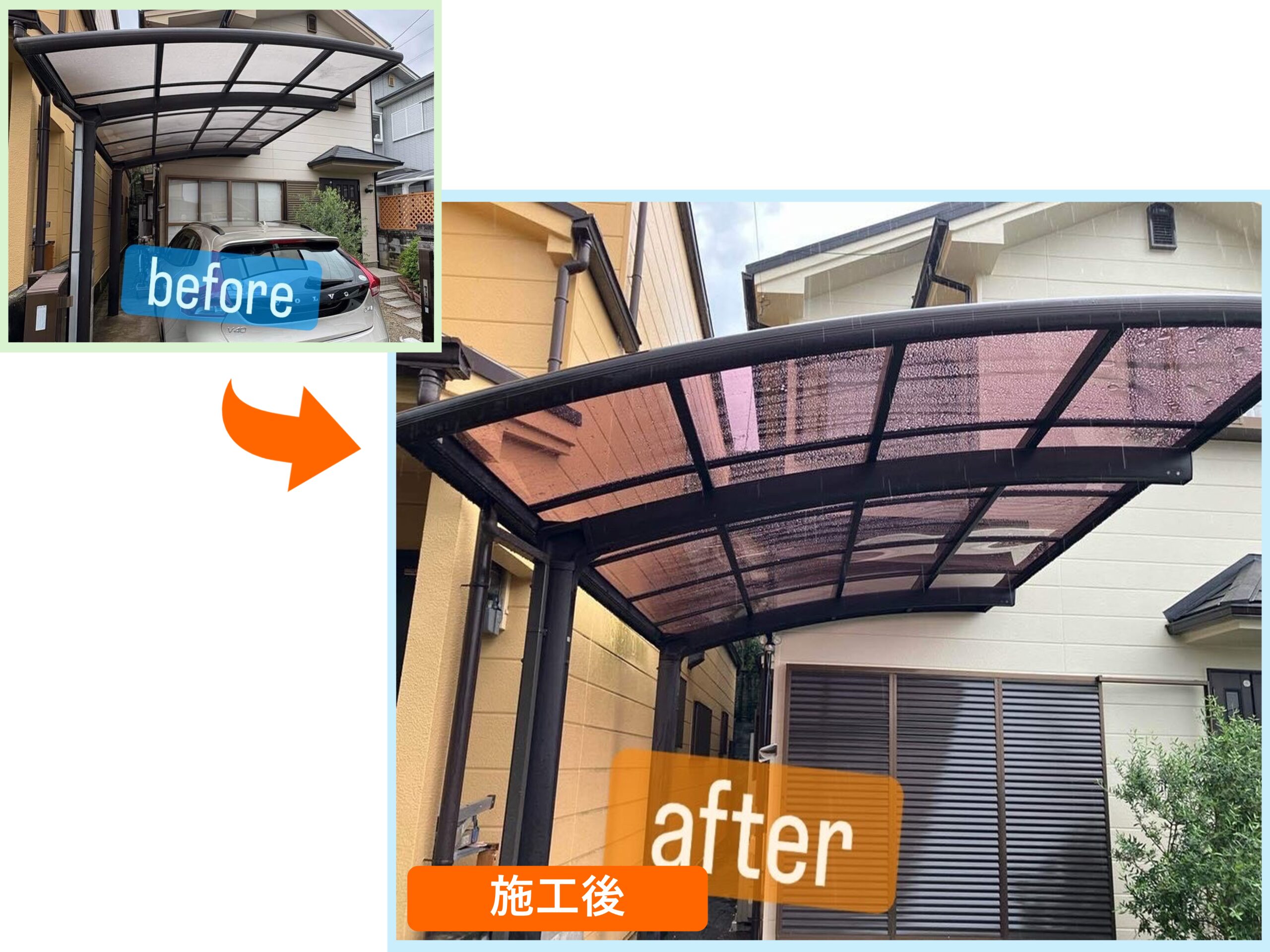 今回は外壁塗装の工事に合わせて、カーポートの汚れや経年劣化が見られる箇所の修繕もご依頼いただきました。